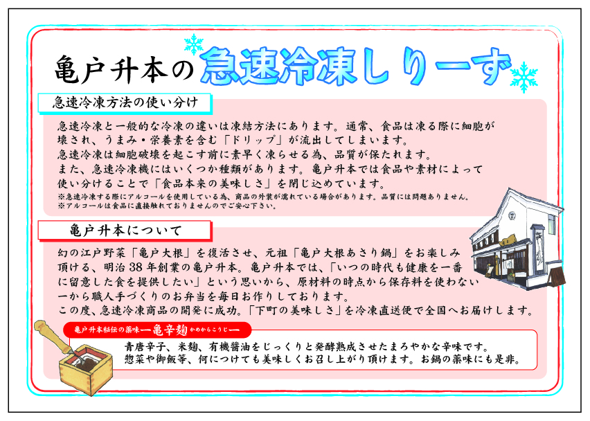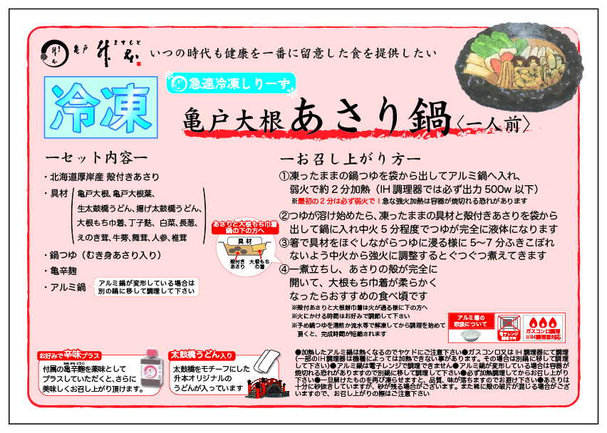そのまま火にかけるだけで、亀戸升本本店の味を御自宅で手軽にお楽しみいただけます。