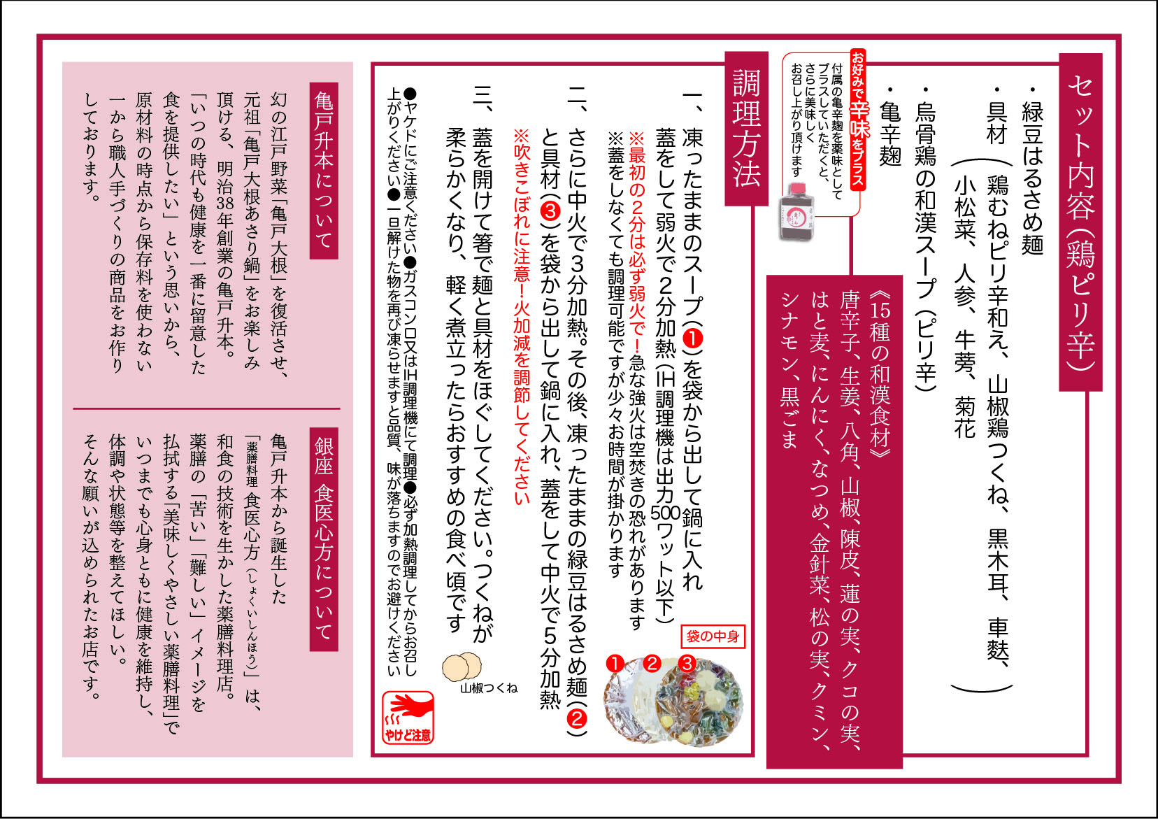 15種類の和漢:唐辛子、生姜、八角、山椒、陳皮、蓮の実、シナモン、はと麦、クコの実、なつめ、金針菜、松の実、クミン、にんにく、黒ごま